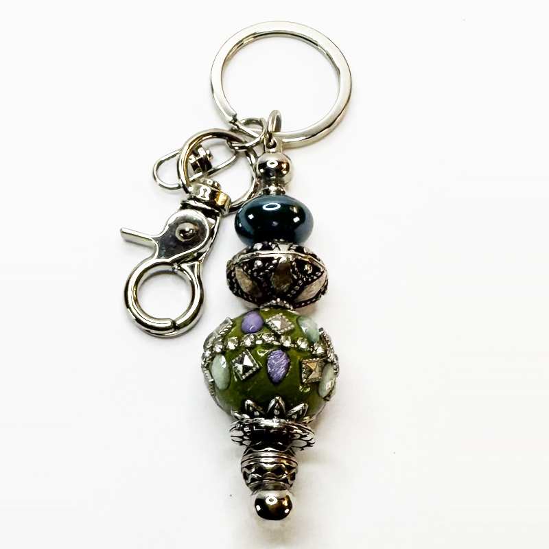 Silver Keychain Green, Metal Oval Bead and Light Green Bead with Silver, Purple and Green Accents (Bead – 3/4 inch, Key Ring – 1 inch)