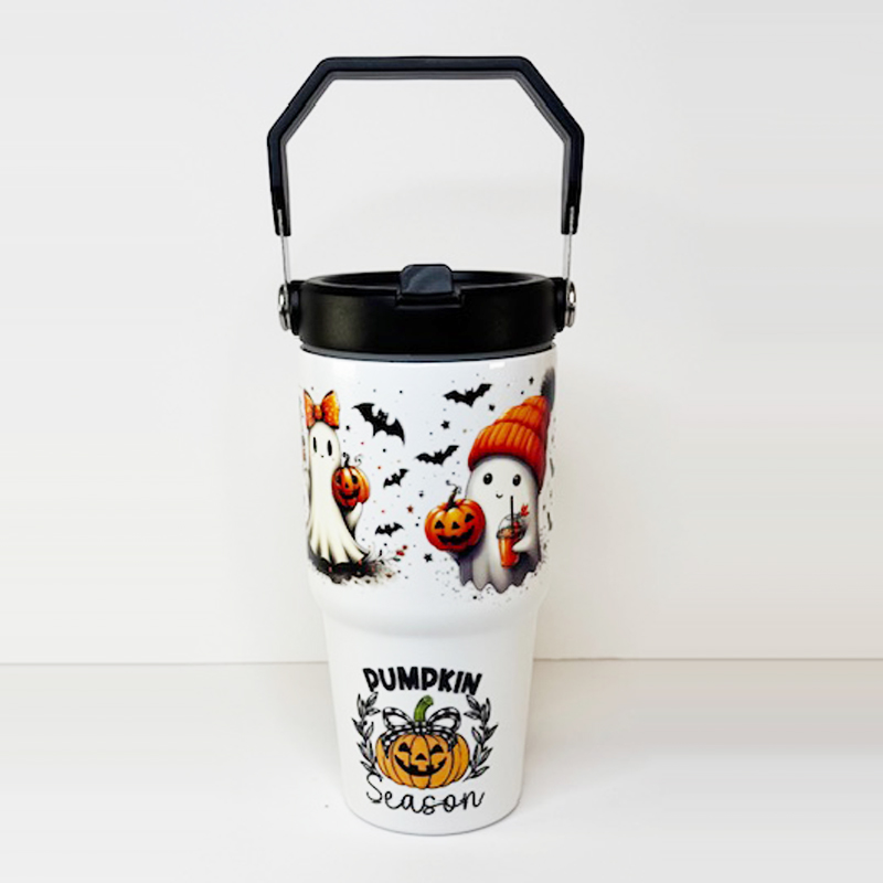 White 2 Ghost and Pumpkin Tumbler with Black Lid – Front View
