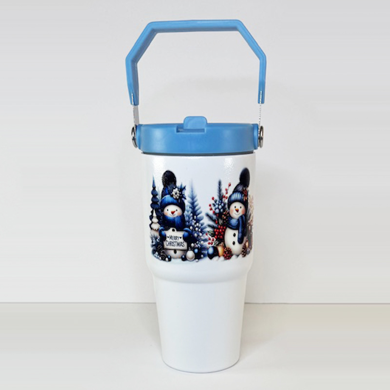 White Tumbler with Blue Lid and Handle – Snowman Images